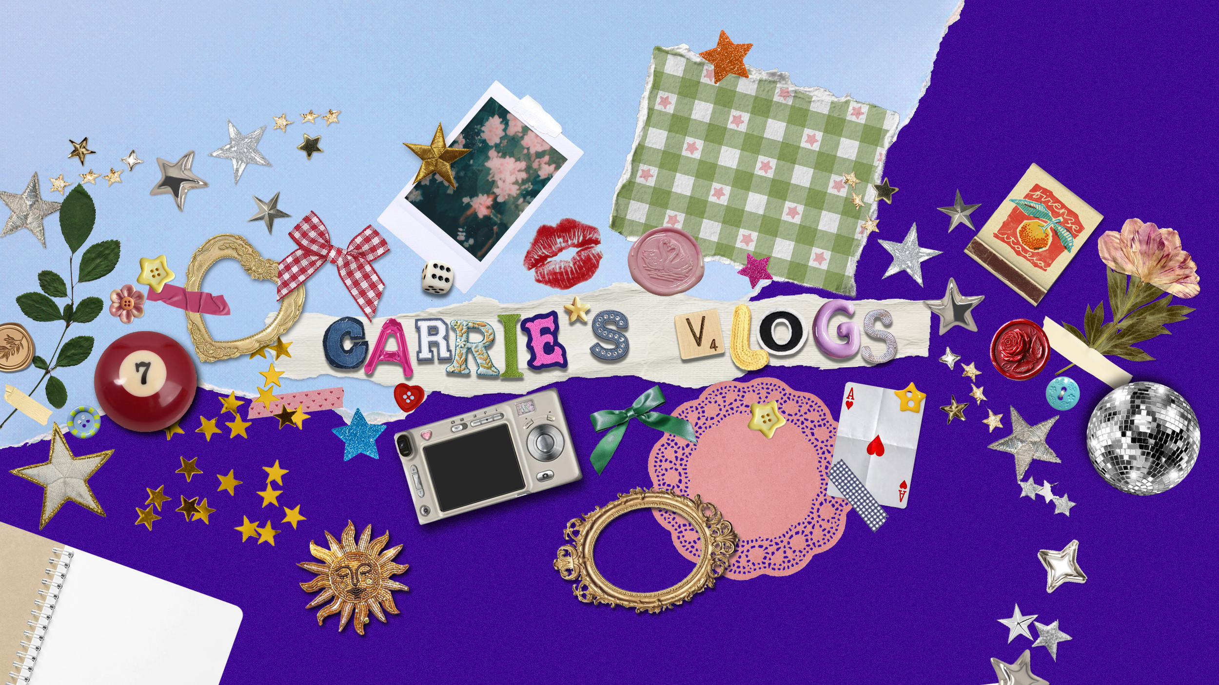 A 2026 scrapbook-style branding refresh for Carrie Dayton’s vlog channel including channel banner (optimized for mobile, desktop, and TV), video end slate, and watermark.
